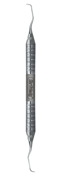 Stiv (rigid) dobbeltsidig Gracey curette. Vinklet for å nå de mesiale overflatene på de bakre tennene.